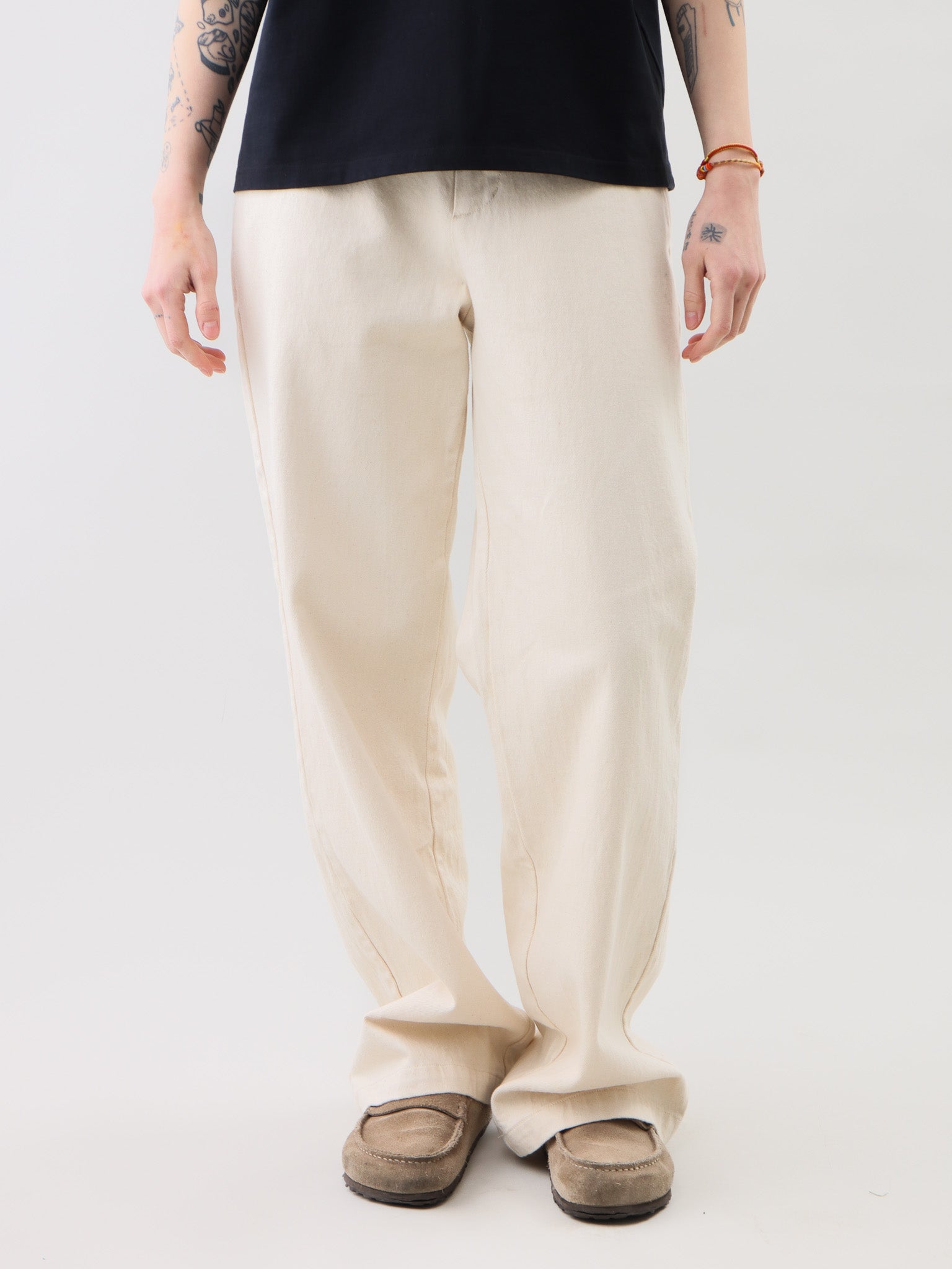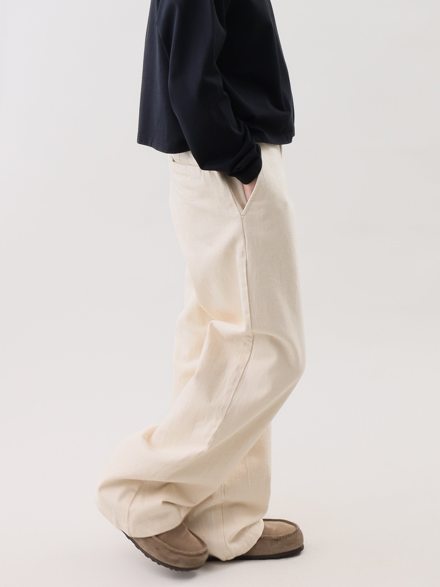 - The natural texture not only presents a primitive simplicity but also gives the trousers comfort and durability.